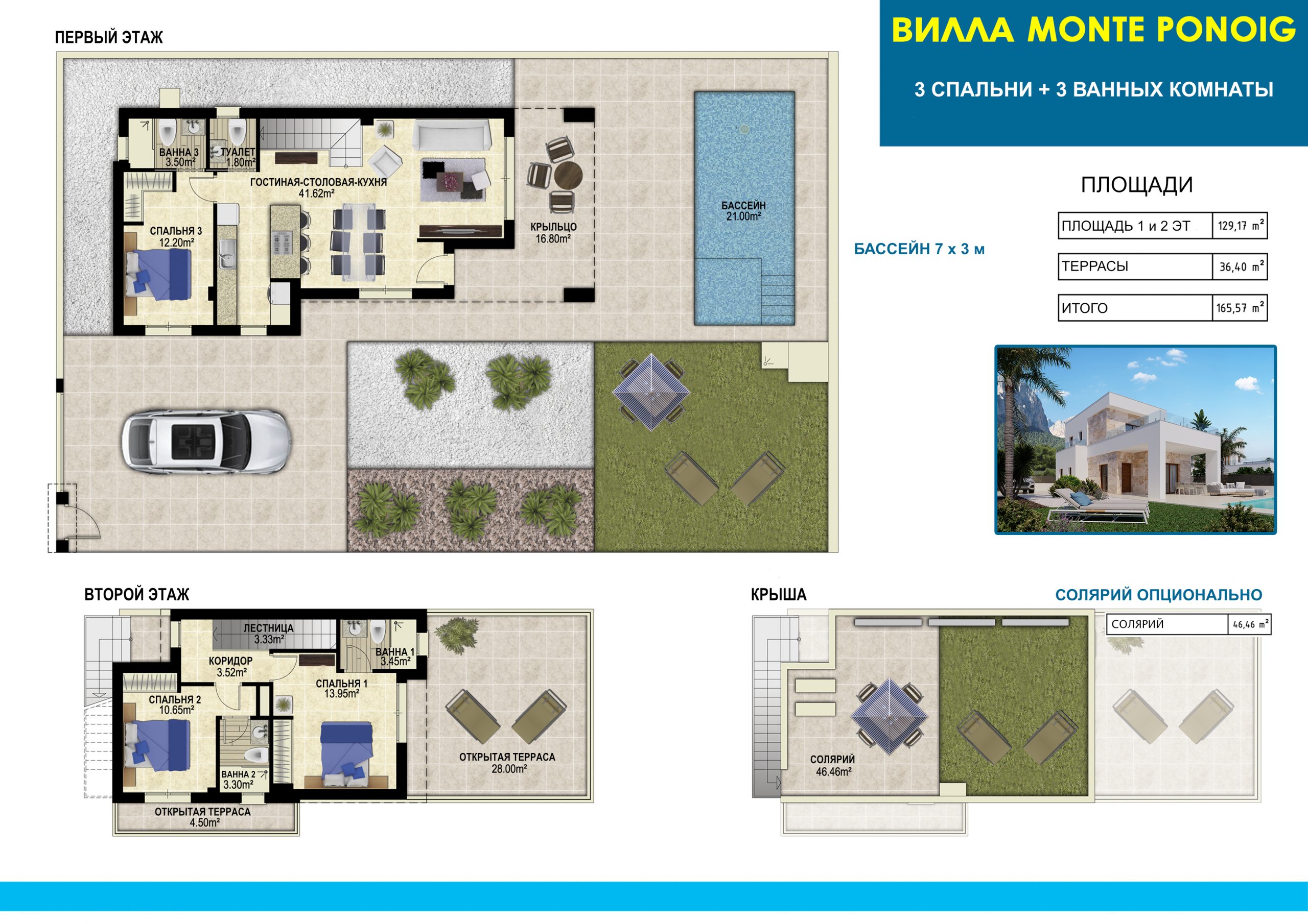 Планировка: - 1 этаж. Спальня - 12,2 кв.м., санузел - 3,5 кв.м., гостевой санузел - 1,8 м.кв., гостинная-столовая-кухня - 41,6 кв.м., крыльцо - 16,8 кв.м. - 2 этаж. коридор - 3,52 кв.м., спальня 1 - 13,95 + санузел - 3,45 кв.м., спальня 2 - 10,65 кв.м. + санузел - 3,3 кв.м., открытая тераса - 28 кв.м. - Крыша. Солярий - 46,46 кв.м.
